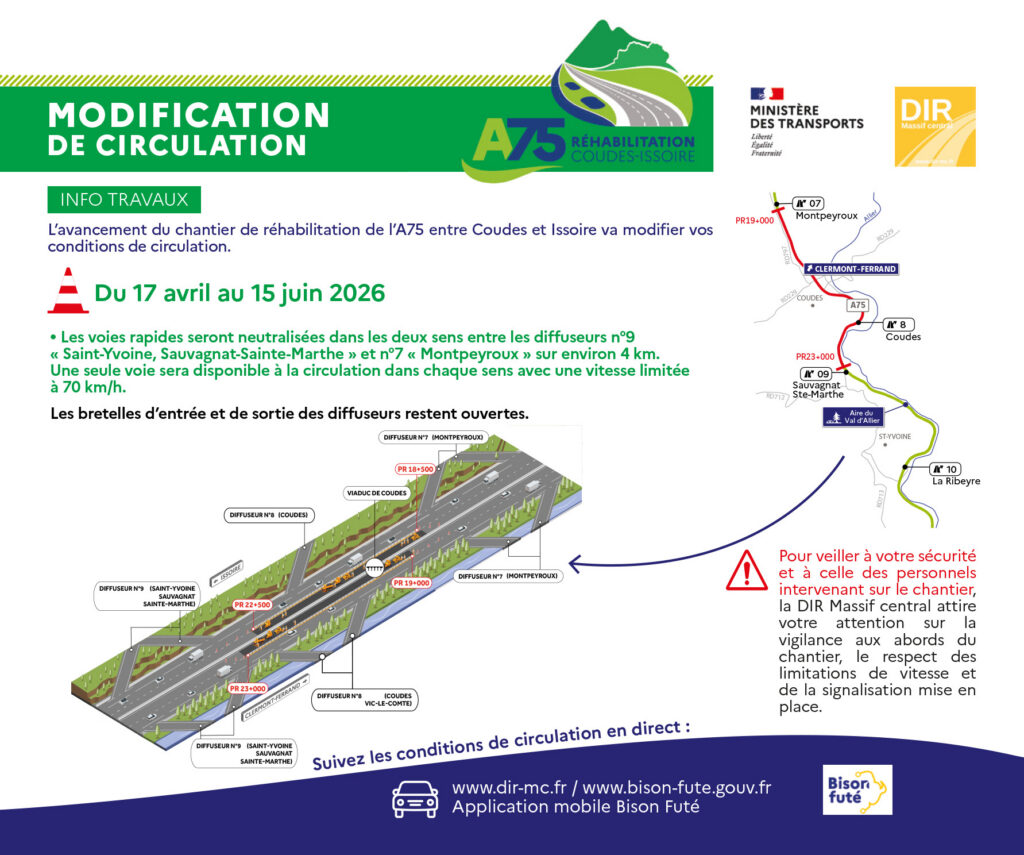 Les voies de gauche (voies rapides) seront neutralisées dans les deux sens entre les diffuseurs n°7 « Montpeyroux » et n°9 « Saint-Yvoine, Sauvagnat-Sainte-Marthe », sur environ 4 km ;