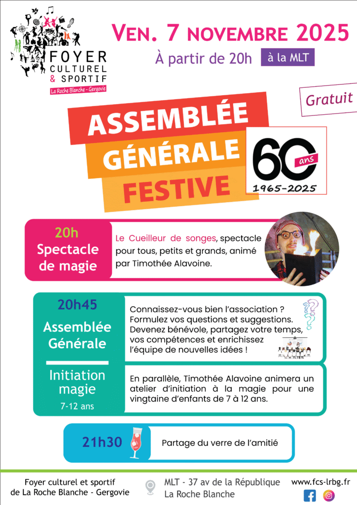 1965… 2025 : à l’occasion des 60 ans du Foyer, nous vous invitons à une assemblée générale festive au format divertissant et convivial, en 3 actes :